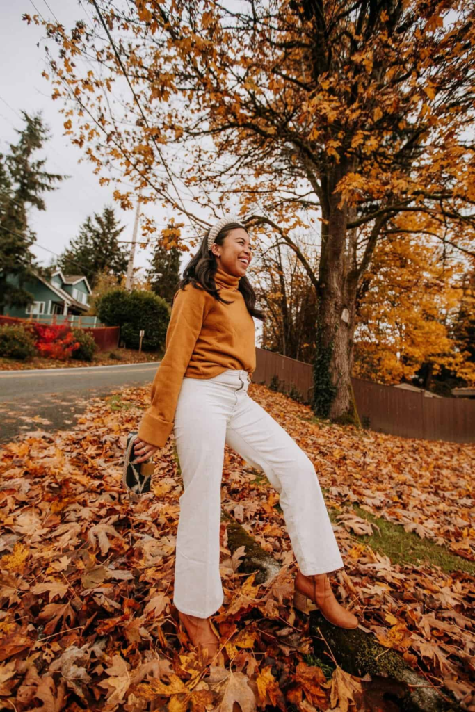 A mustard turtleneck paired with white wide-leg pants creates a striking contrast against fall foliage. Camel ankle boots and a matching beanie add warmth and seasonal charm. This outfit feels cozy yet polished, making it perfect for golden-hour autumn photos.