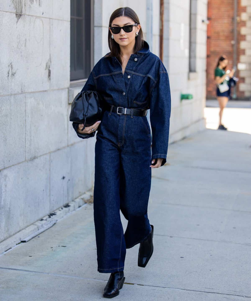 A structured denim jumpsuit creates a clean, modern silhouette. A black belt defines the waist, while ankle boots and oversized sunglasses add polish. This look proves that one strong piece can carry an entire fall outfit.