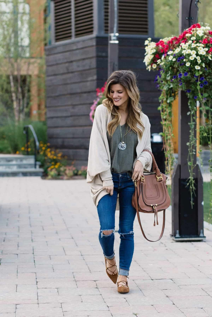 An oversized cream cardigan layered over a muted green top creates a relaxed fall look. Distressed jeans and brown flats keep it casual, while a leather handbag and pendant necklace add warmth and character.