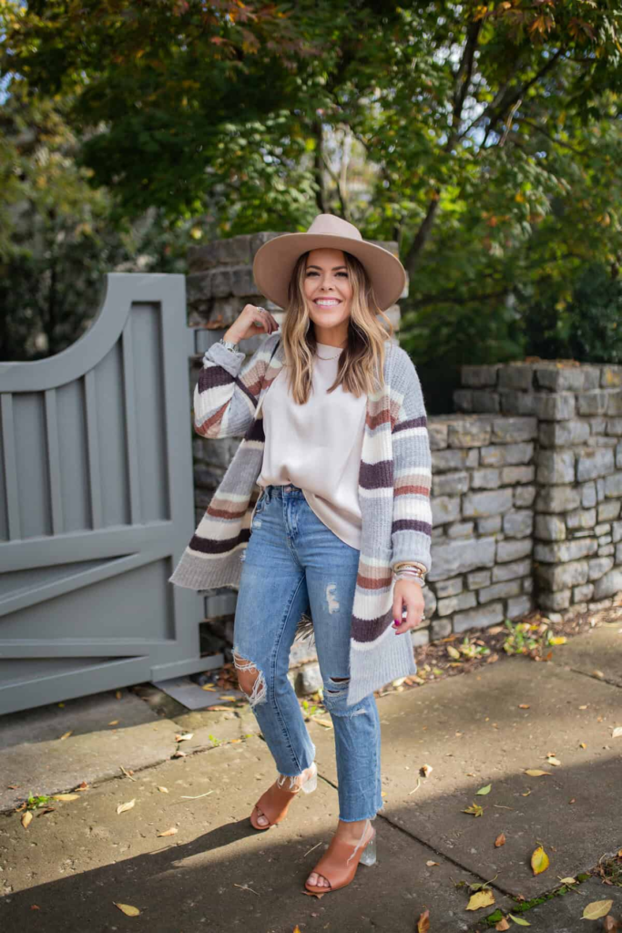 A striped oversized cardigan in warm tones becomes the focal point of this outfit. Paired with a cream sweater and distressed jeans, it blends comfort with fall texture. A wide-brim hat completes the cozy aesthetic.