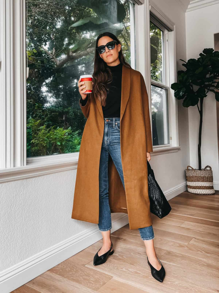 A long caramel coat layered over a black turtleneck and cropped jeans creates a balanced fall outfit. Oversized sunglasses and pointed flats add city-style elegance, perfect for coffee-in-hand autumn photos.