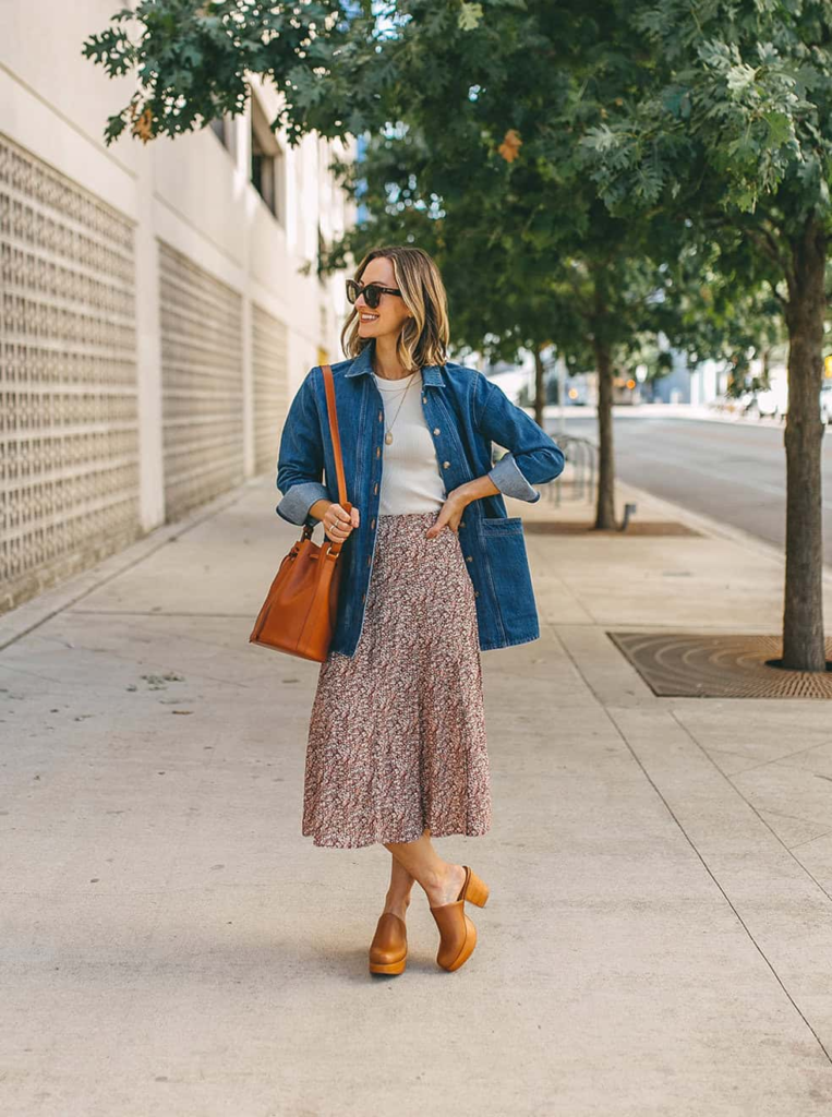 A denim jacket paired with a floral midi skirt blends casual and feminine elements. Warm-toned accessories enhance the autumn feel, making this outfit versatile and visually appealing.