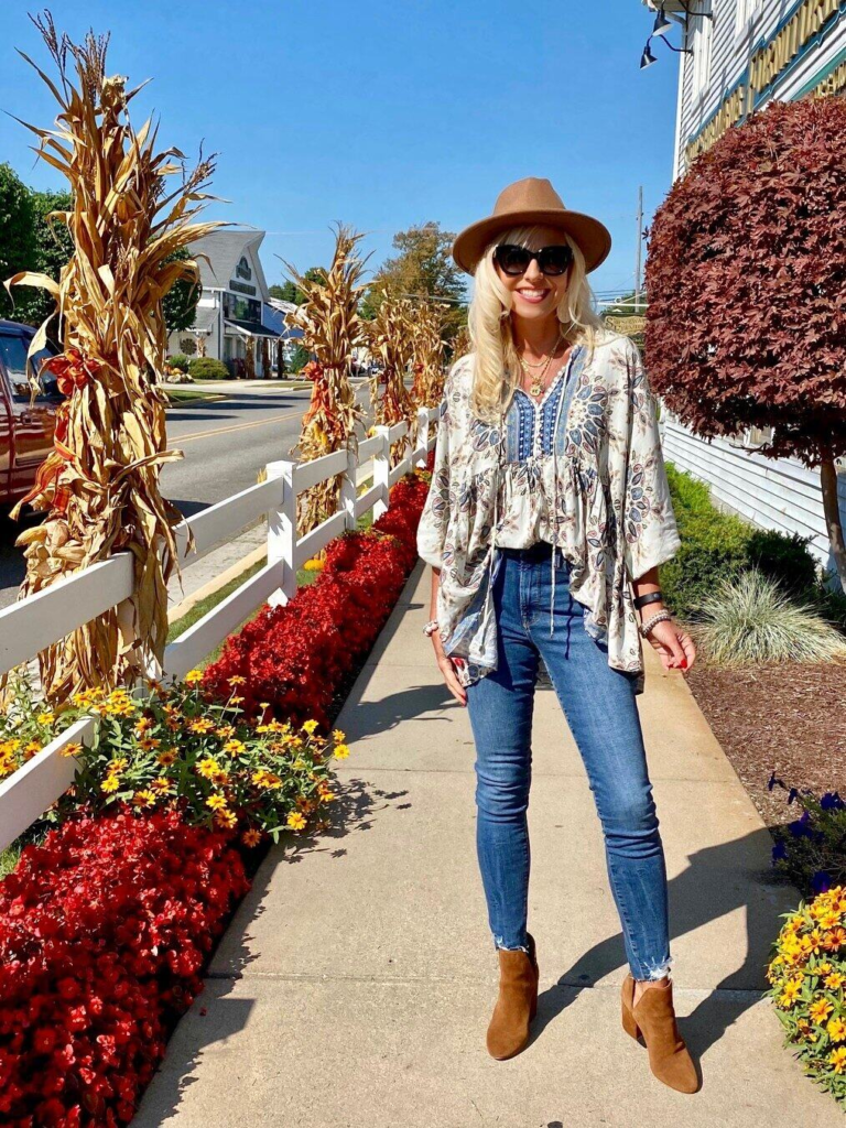 A patterned kimono layered over a blue-accented top creates a relaxed boho vibe. Classic jeans and suede boots ground the look, while a fedora adds personality and fall charm.
