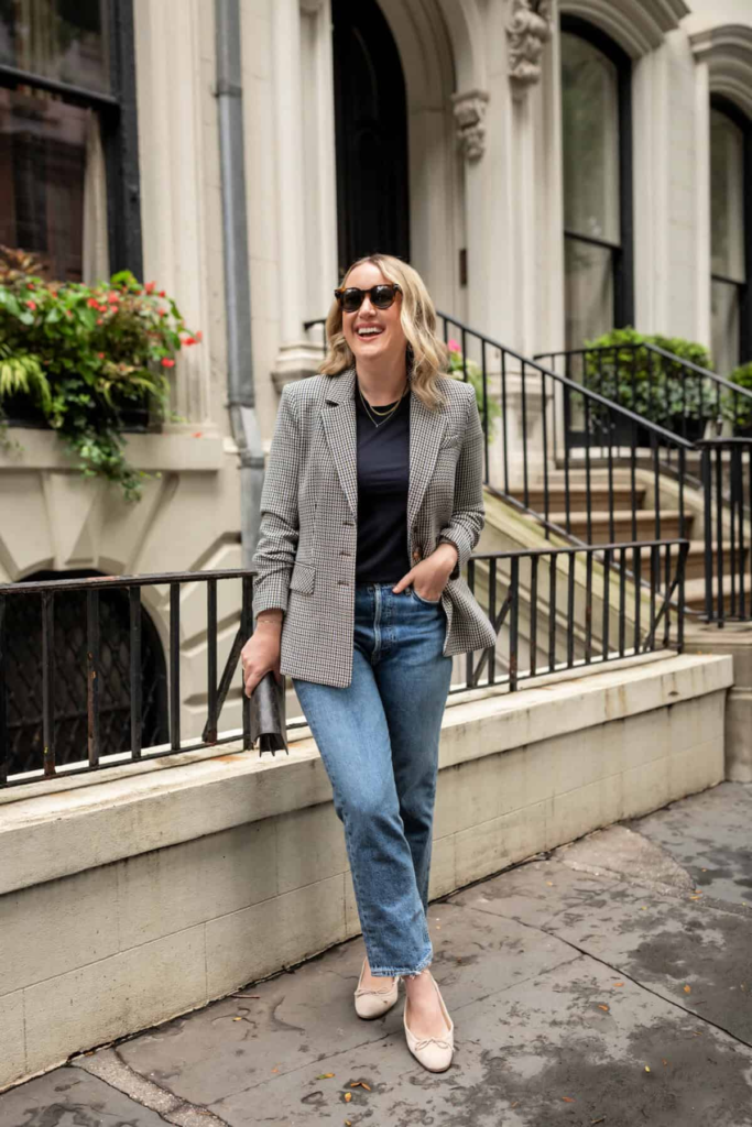 A neutral plaid blazer elevates a simple black top and blue jeans. Ballet flats and sunglasses keep it comfortable yet polished, making it perfect for crisp fall city photos.