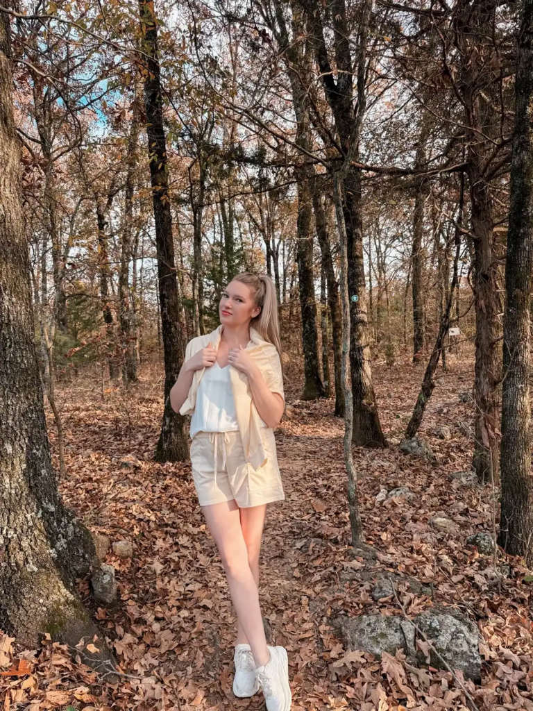 A monochrome cream outfit stands out against golden fall foliage. The relaxed fit keeps it comfortable, while white sneakers maintain a clean, photo-ready look.