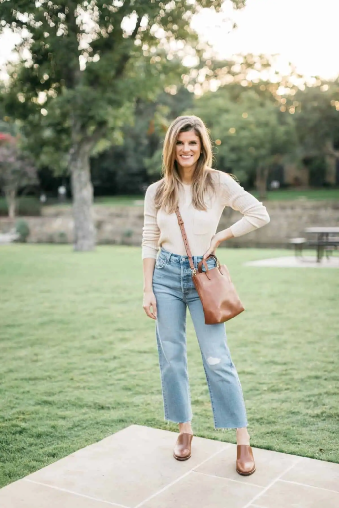 This outfit blends light denim with a soft cream sweater to create a comfortable transition look. The sweater adds warmth, while the jeans keep the outfit relaxed and casual.