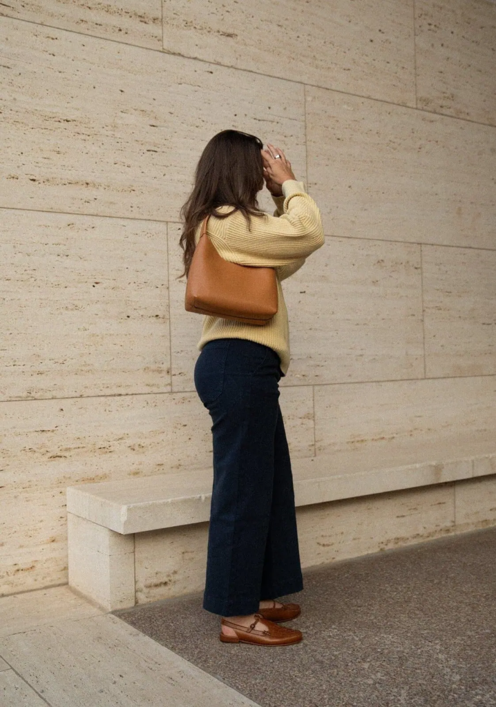 Leather accessories in warm shades add depth and make the outfit suitable for both work and casual settings.