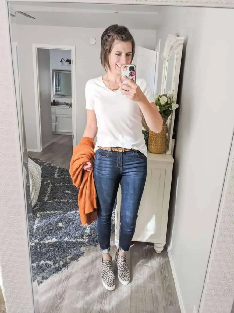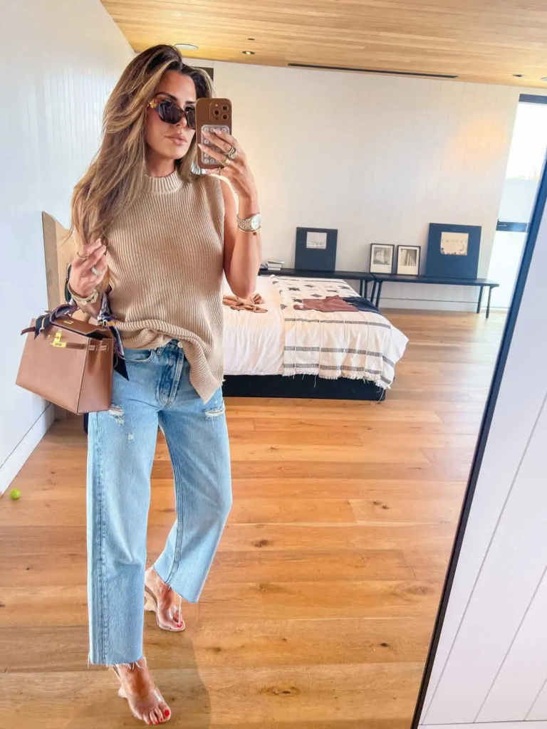 This look uses a sleeveless knit to manage changing temperatures while still adding texture. Distressed jeans keep the outfit casual and versatile.