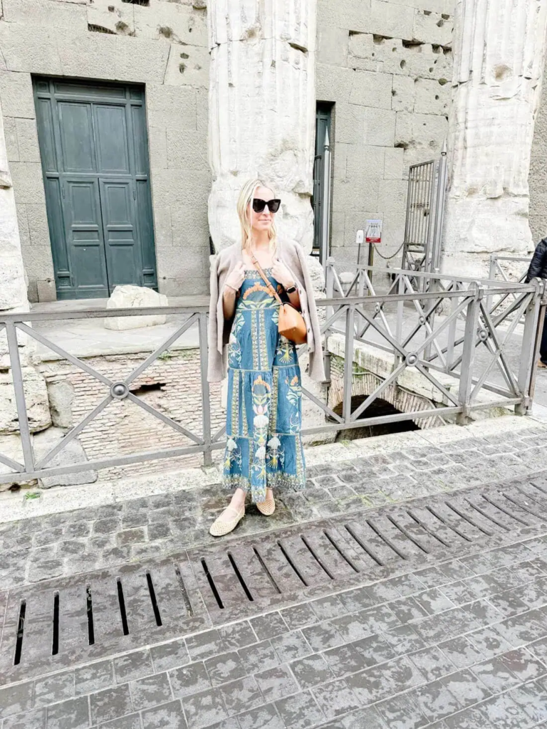 This look combines a flowing embroidered dress with a relaxed cardigan for warmth. The mix keeps the outfit grounded between summer ease and fall comfort.