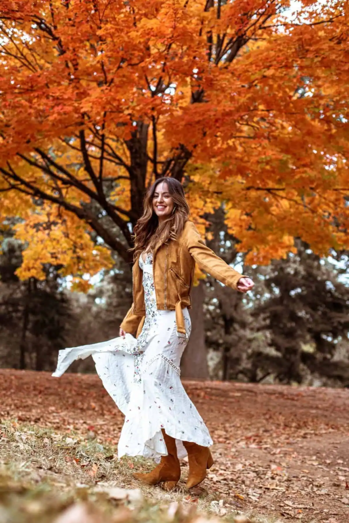 This ensemble layers a bright floral dress with richer fall textures. The leather jacket and suede boots shift the look toward cooler weather.