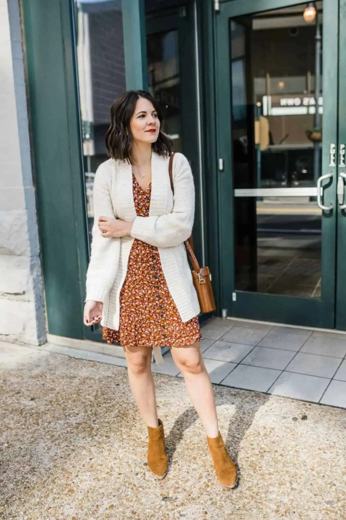 This look blends a warm-toned floral dress with a thick cardigan for added comfort. The combination works well from day to evening.