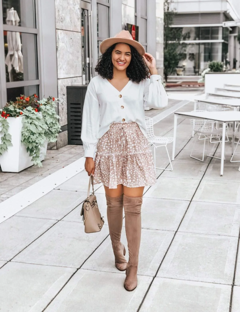 This ensemble balances light fabrics with fall footwear. The blouse and skirt feel summery, while tall boots signal cooler weather.