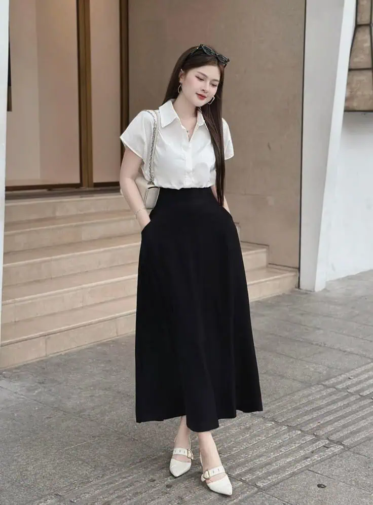 This black-and-white outfit feels timeless and easy to wear. The long skirt allows for comfort and movement, while the white top keeps the look bright and professional. The simplicity of this combination makes it versatile for different school settings.