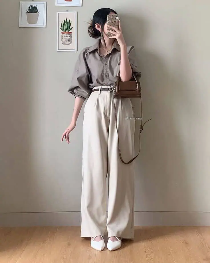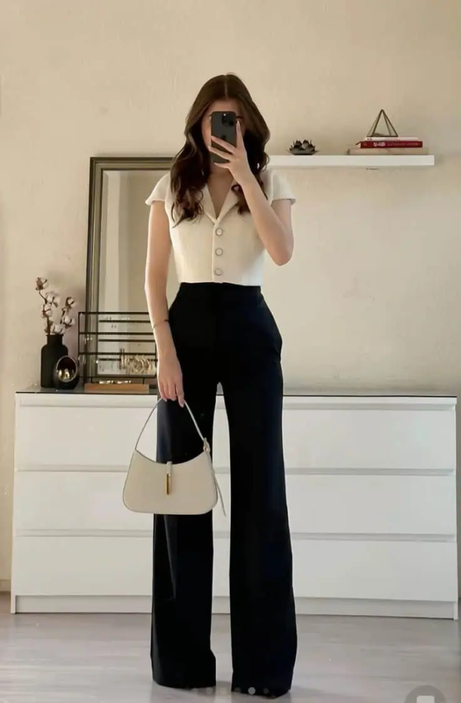 This outfit relies on clean lines and timeless pieces that never go out of style. A white button-down shirt provides structure and professionalism, while wide-leg trousers offer comfort and freedom of movement. This pairing feels modern while still respecting traditional workplace standards.