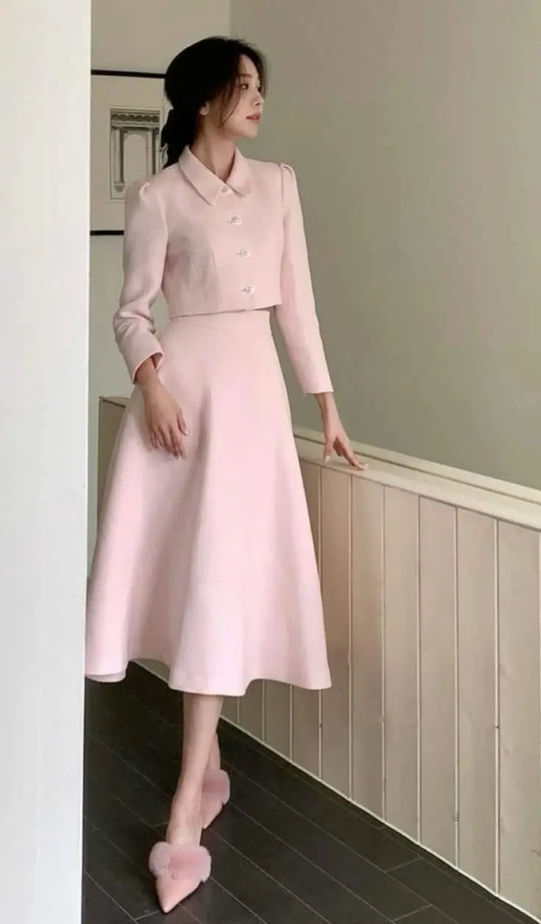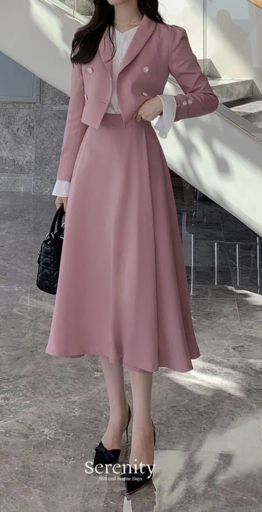 This matching set creates a coordinated and refined appearance. The soft pink color adds warmth without feeling overly casual. The jacket and skirt combination feels structured and professional.