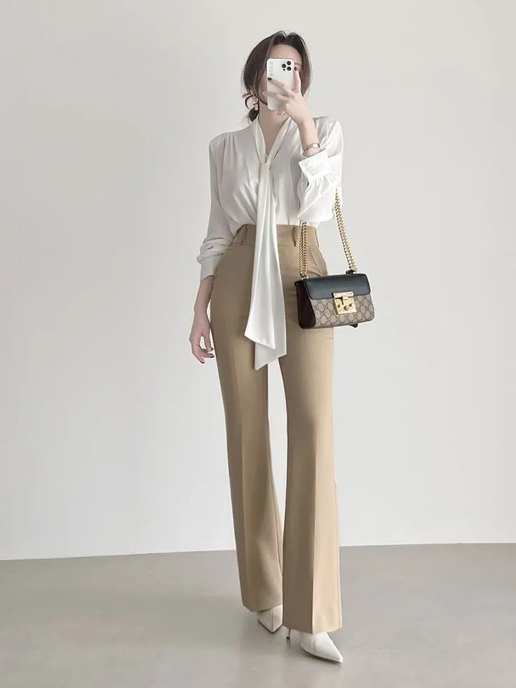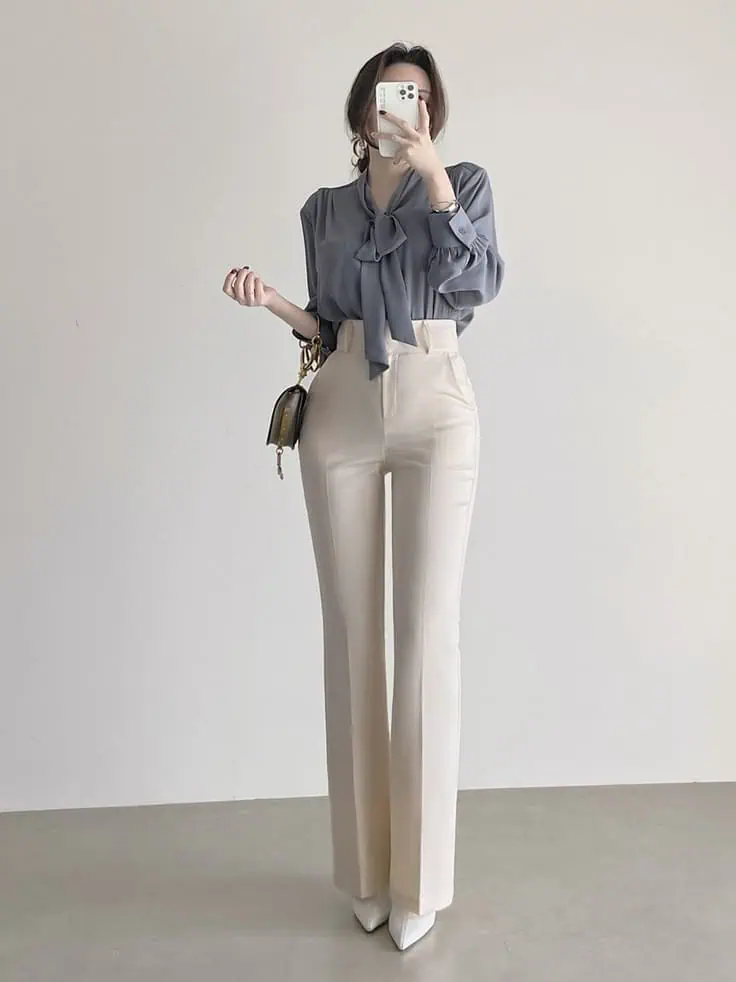 This ensemble blends softness and structure. The bow blouse introduces a gentle, feminine detail, while the trousers keep the look grounded and professional.