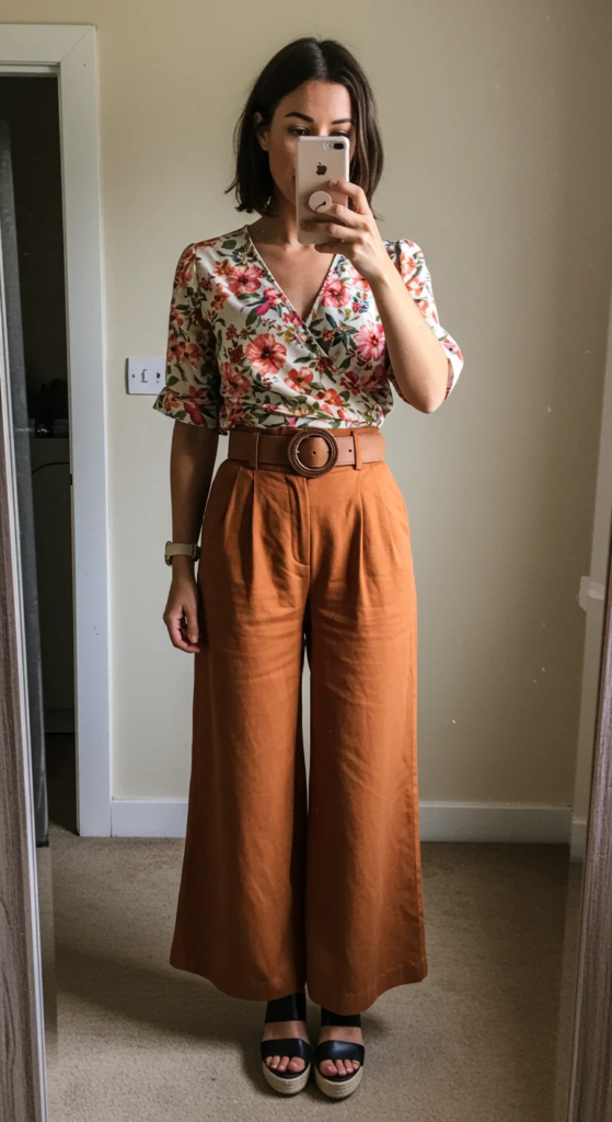 Pair it with high-waisted palazzo pants that offer breathability and freedom of movement.