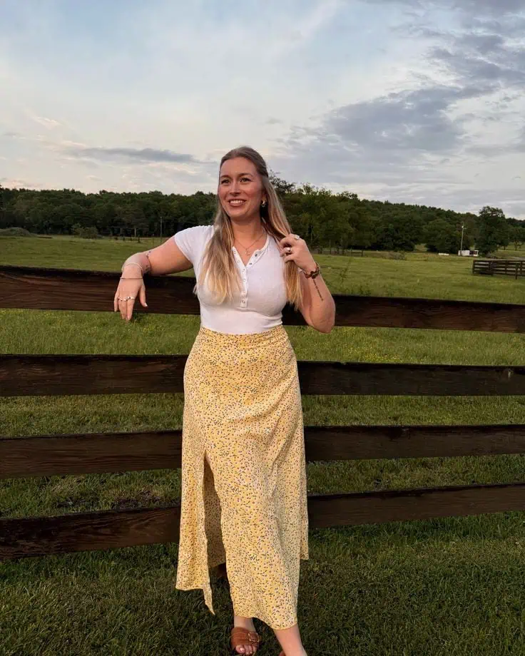 Bright colors always remind people of summer. A yellow top makes the outfit stand out, while a printed skirt keeps the look balanced.