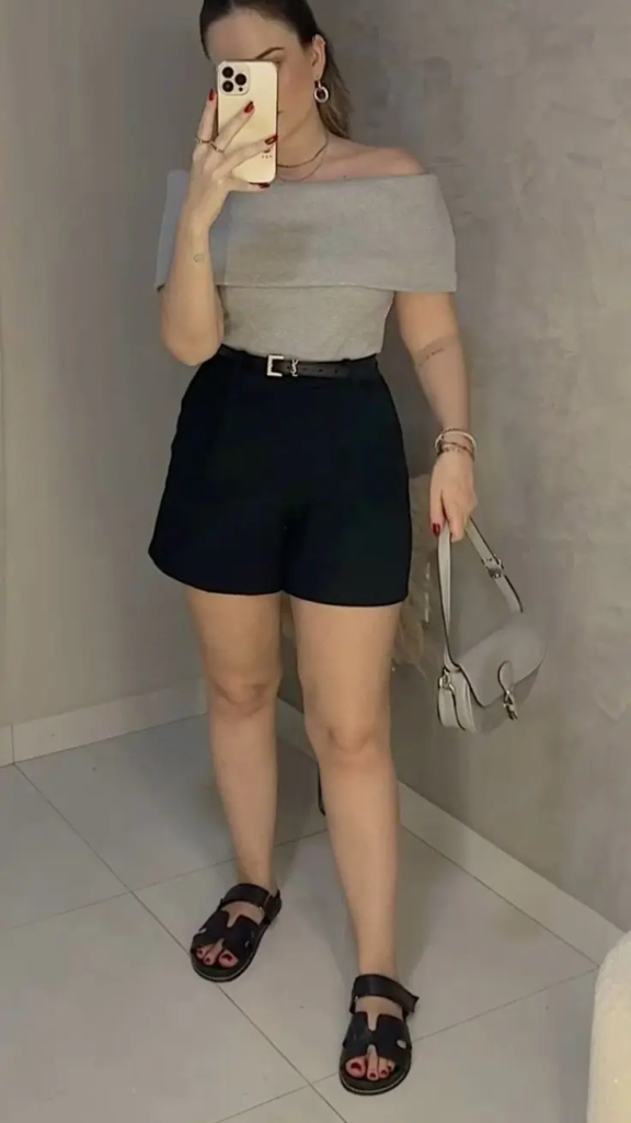 An off-shoulder top feels relaxed, but pairing it with simple shorts keeps the outfit balanced.