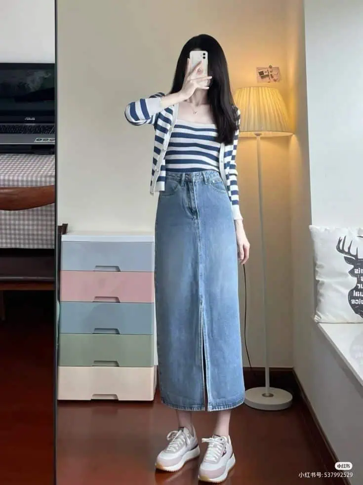A striped polo shirt adds a clean, slightly preppy touch. Paired with a denim midi skirt, the outfit feels classic yet current.