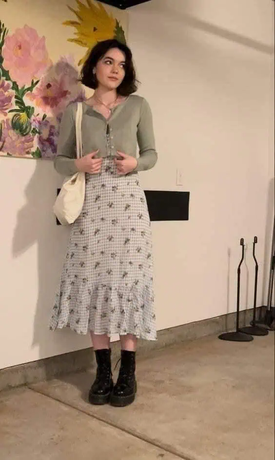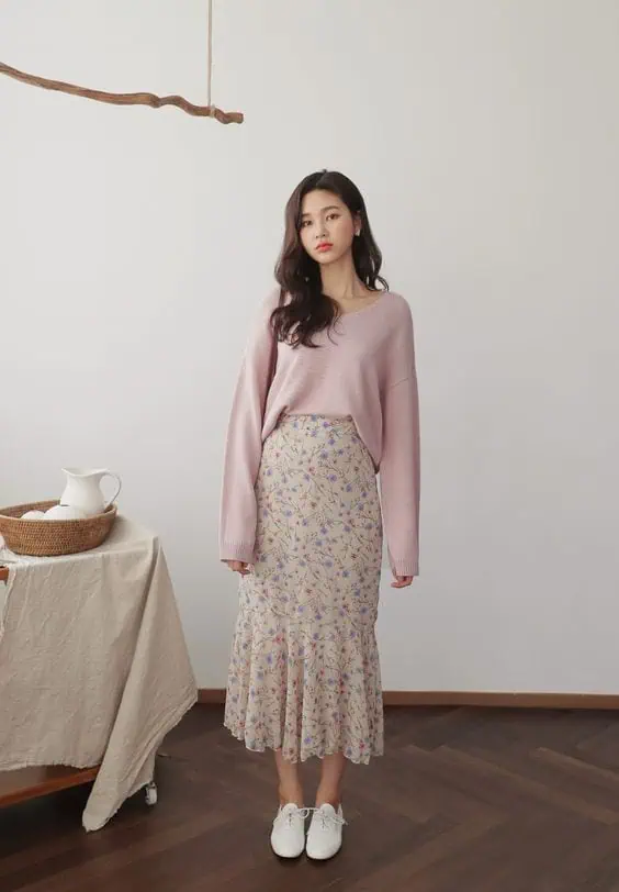 An oversized sweater combined with a floral midi skirt delivers comfort with charm.