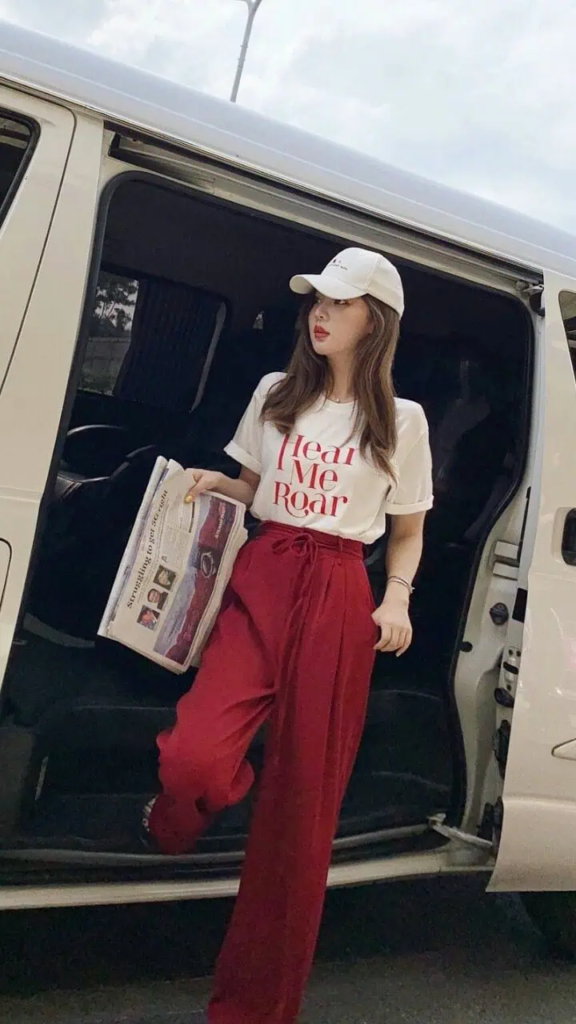 A graphic tee adds personality and attitude. Paired with wide-leg pants, the outfit becomes bold yet comfortable.