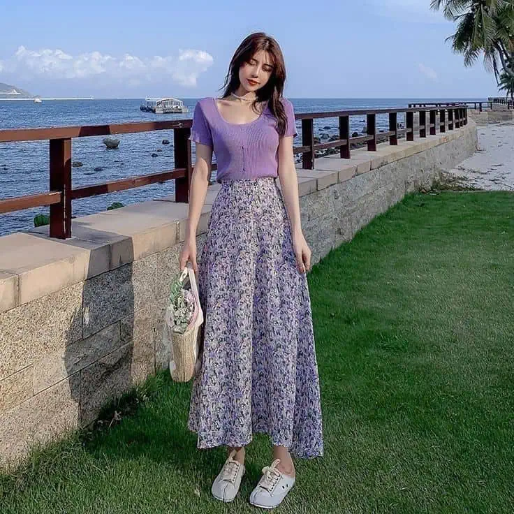 Soft lavender tones paired with a floral maxi skirt create a gentle, romantic aesthetic.