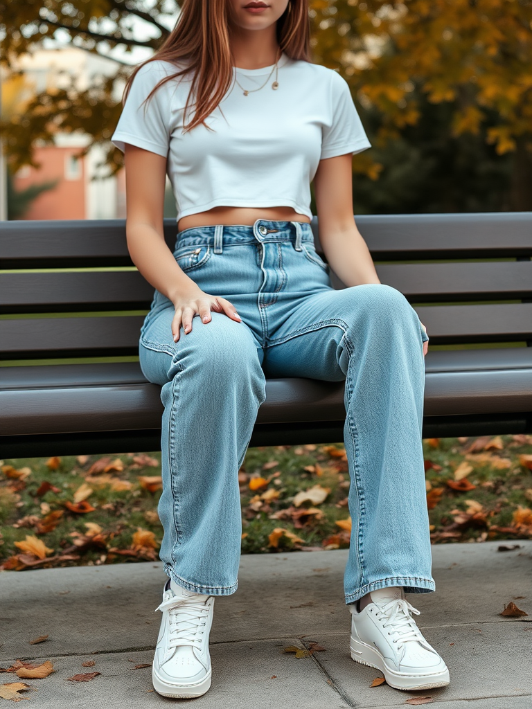 A crop top balances the volume of the jeans, creating a modern silhouette. When fall breezes kick in, layering becomes key. Throw on a cardigan, denim jacket, or oversized blazer to adapt the look for changing temperatures. Sneakers keep it casual, while boots can dress it up slightly.